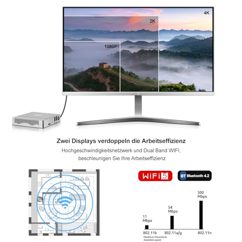 Schnellere Internetverbindung: Der Mini-PC unterstützt die neuesten Bluetooth 4.2- und 2,4G+5,0G-Dualband-WLAN-Technologien sowie 1000 Mbit/s LAN. Bluetooth 4.2 nutzt drahtlose Hochgeschwindigkeitsverbindungstechnologie, um Ihnen die Verbindung mehrerer drahtloser Geräte wie Maus, Tastatur, Lautsprecher usw. zu ermöglichen. 2,4G/5G WIFI unterstützt Netzwerk-Weckfunktion, Sie können schnell Filme ansehen, Video-Streaming surfen, 4K-Webbrowsing, leichte Spiele und das tägliche Büro genießen.