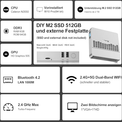 Celeron N3350 CPU: Der Mini-PC wird von den neuesten Celeron N3350 CPU-Prozessoren angetrieben, W10 (64 Bit) ist vorinstalliert und sorgt für blitzschnelle Leistung und reibungsloseren Betrieb. Der Mikro-PC mit integriertem 64 GB eMMC-Hochgeschwindigkeits-DDR3-RAM sorgt für einen reibungslosen Systembetrieb. 4K UHD 505-Grafikkarten können Aufgaben wie das Öffnen großer Bilder, Videos und Online-Formulare problemlos verstreben und bieten eine erstklassige Bildqualität.
