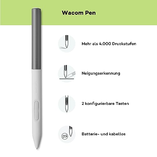 Inklusive Wacom One Standardstift: batterieloser EMR-Stift mit 4k Drucksensitivität, Neigungserkennung, praktisch keiner Verzögerung und 2 frei programmierbaren Tasten.
