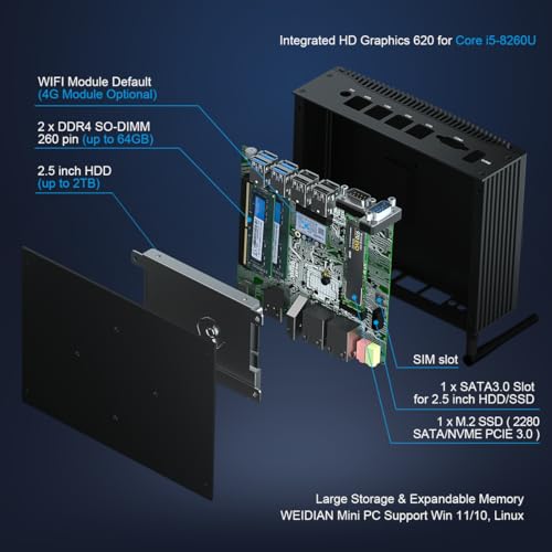 【NEUER, UPGRADIERTER Mini Industrie PC】➥ Dieser H7 Mini computer ist mit Win 11 Pro vorinstalliert und verfügt über einen Quad Core i5 8260U Prozessor der 8. Generation, UHD Grafik 620, Einzelkanal DDR4 SO-DIMM, 260 Pin, 2133 MHz, TDP 15 W. Hochgeschwindigkeits verbindungsoptionen und müheloses Multitasking, stabile, starke und hohe Druckleistung, brauchbar für den guten Betrieb in verschiedenen Geschäfts, Heim, Arbeits und Industrie umgebungen.