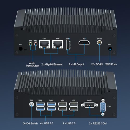 【DOPPELTE HD DISPLAYS】➥Der H7 Industrial Mini Desktop PC unterstützt gleichzeitig zwei unabhängige Displays für unglaubliche Klarheit und maximale Produktivität in Ihrem Arbeitsablauf. Ausgestattet mit 4xUSB3.0, 4xUSB2.0, 2xRJ45 LAN, 2xHD und Kensington Lock, das an Ihre Multimediageräte, Maus, Akustik oder Headset angeschlossen werden kann. Der lüfterlose Mini-PC unterstützt die Verbindung mehrerer Geräte und kann mit Servern, Überwachung, Displays, Projektoren und Fernsehern verwendet werden.