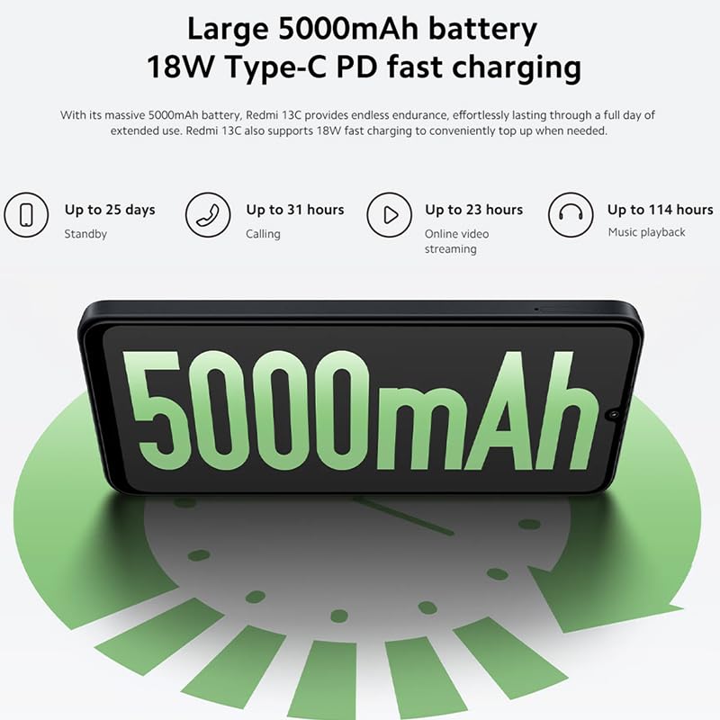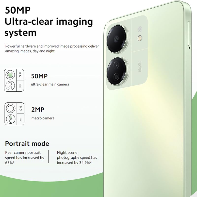 50MP Ultra-clear imaging system: Redmi 13C have 50MP ultra-clear main camera, 2MP macro camera. Camera system’s powerful hardware and improved image processing deliver amazing images, day and night.