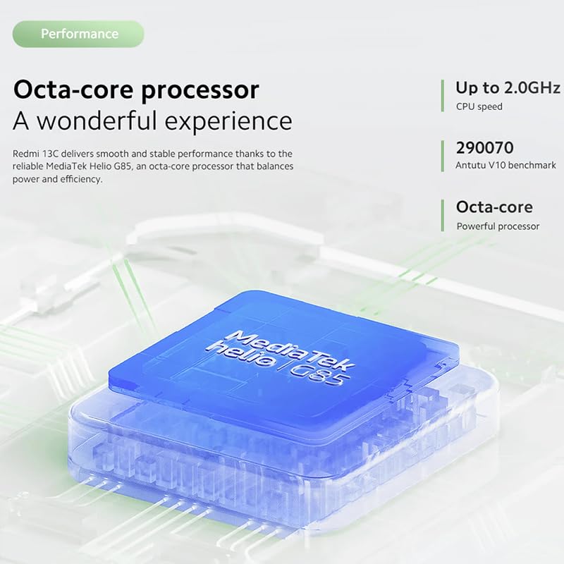 Wonderful Experience Octa-core Processor: Redmi 13C delivers smooth and stable performance thanks to the reliable MediaTek Helio G85, an octa-core processor that balances power and efficiency.