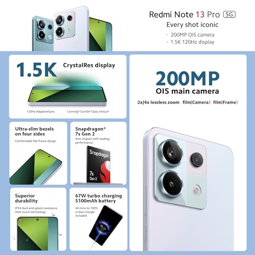 Xiaomi Redmi Note 13 Pro 5G Aurora Purple – Smartphone 8 + 256 GB, Snapdragon 4-nm-Prozessor, 200 MP Kamera, 120 Hz AMOLED-Display, 67 W, 5100 mAh, 3D-Curved-Display