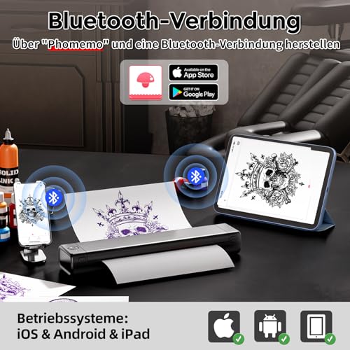 Bluetooth Tattoo-schablonendrucker: Der tattoo-schablonendrucker unterstützt bluetooth-verbindung zugunsten iPhone und Androide-handys, tablet; unterstützt USB-verbindung zugunsten laptops und desktop-computer, kompatibel mit Windows, MacOS, ChromeOS und Linux-systemen